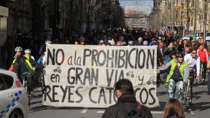 • El Ayuntamiento de Granada ha aprobado el Plan de Movilidad Urbana Sostenible con el que, entre otras medidas, amenaza con prohibir el paso a los ciclistas por Gran Vía y Reyes Católicos, eje norte-sur que concentra el mayor número de desplazamientos en bici de la ciudad.