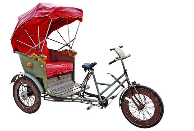rickshaw -inventado por el reverendo baptista americano Jonatah Scobie, cuya esposa debía recibir asistencia por una enfermedad crónica-, y que funciona como una carretilla impulsada a la que más tarde se la añadiría una bicicleta, sustituyendo así la tracción humana. Una alternativa saludable que permite desplazarse en las ciudades, sobre todo, en las zonas céntricas, contribuyendo así a aliviar la congestión del tráfico contaminante.