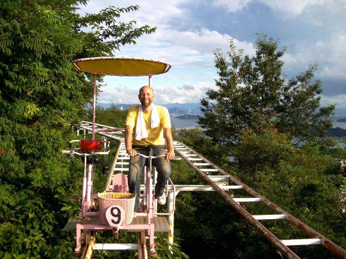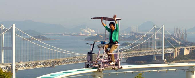 La ciudad japonesa de Okayama posee una atracción de feria llamada “Skycycle”, que no es otra cosa que lo que conocemos como Montaña Rusa, con la diferencia que en la “Skycycle” los carros son una especie de tándem impulsados por el pedaleo de los propios usuarios.