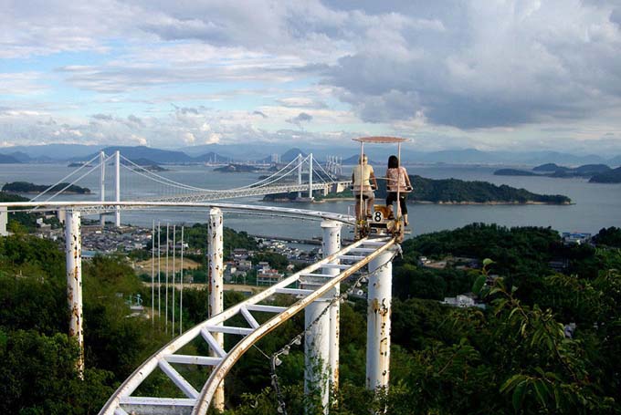 Washuzan Highland Park” está en Okayama, Japón, una provincia con una dramática topografía montañosa de la cual se aprovecharon los diseñadores de esta montaña Rusa para crear un entretenimiento para los amantes del pedal y que sólo es apto para la gente sin miedo al vértigo (¡Esto ténganlo por seguro!)