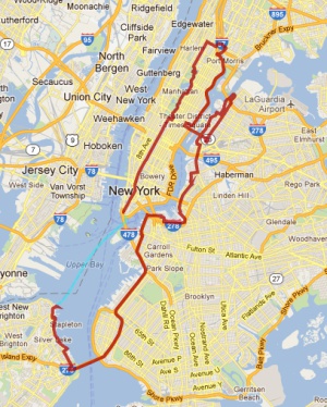 Recorrido: Aunque sólo mirar el mapa agota, esta ruta es una experiencia única. El tour recorre los cinco barrios de Nueva York (Bronx, Queens, Manhattan, Brooklyn y Staten Island.), lo que equivale a un total de 40 millas (64 kilómetros).