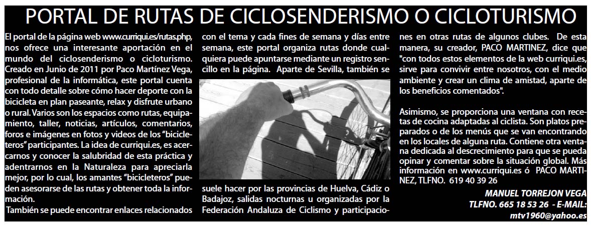 También se puede encontrar enlaces relacionados con el tema y cada fines de semana y días entre semana, este portal organiza rutas donde cualquiera puede apuntarse mediante un registro sencillo en la página. Aparte de Sevilla, también se suele hacer por las provincias de Huelva, Cádiz o Badajoz, salidas nocturnas u organizadas por la Federación Andaluza de Ciclismo y participaciones en otras rutas de algunos clubes. De esta manera, su creador, PACO MARTINEZ, dice que "con todos estos elementos de la web curriqui.es, sirve para convivir entre nosotros, con el medio ambiente y crear un clima de amistad, aparte de los beneficios comentados".