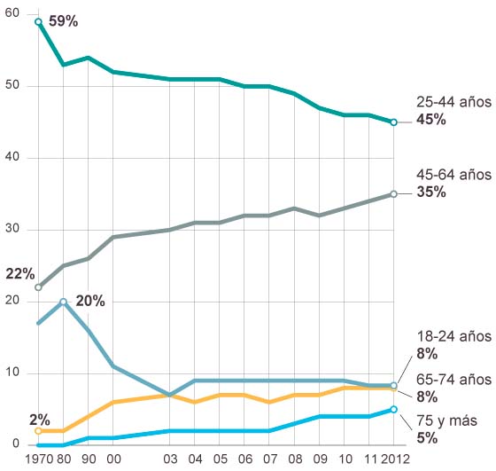 El censo de conductores, que elabora anualmente la Dirección General de Tráfico (DGT), es el principal indicador. En las últimas décadas, el porcentaje de ciudadanos con carné con edades entre 45 y 64 años no ha dejado de aumentar, del 22% en 1970 al 35% en 2012 (último dato disponible). En cambio, ha bajado la proporción de los que tienen entre 18 y 24 años (del 20% al 8%) y entre 25 a 44 años (del 59% al 45%). Los últimos balances de la DGT destacan “el lento pero constante envejecimiento del censo de conductores, en el que año tras año aumentan los porcentajes correspondientes a los tramos de más edad”.
