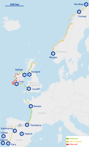 Los 8.186 kilómetros de extensión unirán seis países partiendo por Nordkapp en Noruega, pasando por Reino Unido, Irlanda, Francia, España, hasta llegar a Sagres, al sur de Portugal.