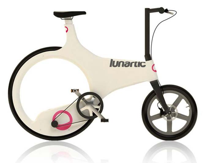 Lunartic es una bicicleta urbana compacta con un concepto que explora un sistema único de tracción, a través de su rueda posterior dentada, la cual carece de radios y buje para generar movimiento.