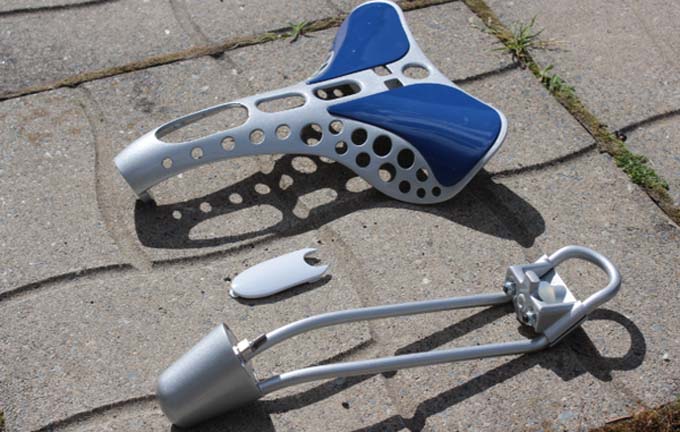 El Namo Seat está fabricado en aluminio de calidad aeronáutica. Utiliza pequeñas piezas mecanizadas de acero que se montan en lo rieles del armazón y polímeros para su cubierta.