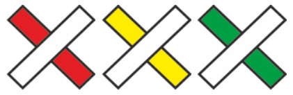 - Marca de Dirección equivocada: composición en aspa con un trazo en blanco, superpuesto a otro del color de la categoría del sendero al que corresponda el inferior. Se utiliza para indicar cual es el camino incorrecto.