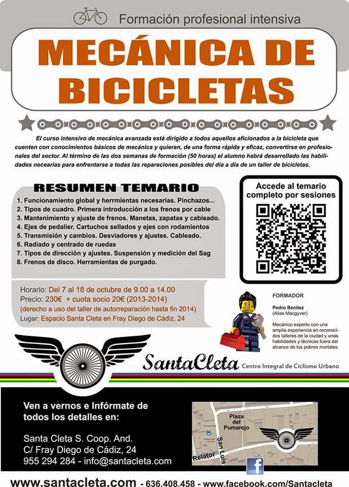 Santa Cleta, con el que quiere fomentar la formación, la autogestión y la pasión por el ciclismo urbano. Combinando aspectos teóricos y prácticos, el curso está dirigido a todos aquellos que quieran profundizar en la mecánica y reparación -nivel medio-experto- a través de un temario que parte de los aspectos más básicos y relevantes, para profundizar en situaciones de mayor complejidad -tipos de dirección o transmisión y cambios-.