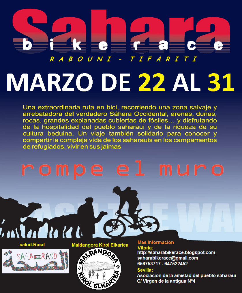 El Sahara Bike Race se ha convertido en una de las travesías más clásicas en bici de montaña. El itinerario, que ofrece un contraste maravilloso -desde impresionantes planicies calcinadas, escaladas o descensos de puertos hasta montañas rojas, palmerales y oasis- transcurre por el desierto saharaui, paralelo al llamado "muro de la vergüenza" (que divide el territorio saharaui en dos, la parte ocupada por marruecos y la parte liberada por el pueblo saharaui). Esta antigua ruta caravanera cruza el desierto desde Marruecos hasta Tombuctú.